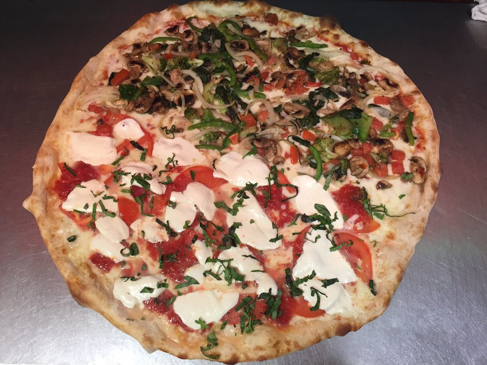 Spinach, broccoli, mushroom, onions, green peppers and mozzarella cheese on pizza sauce - (Small . - Large .)